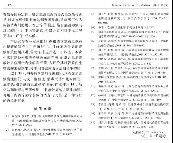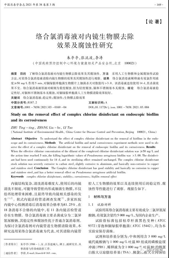 由中國疾病預(yù)防控制中心環(huán)境與健康相關(guān)產(chǎn)品安全所撰寫的《絡(luò)合氯消毒液對內(nèi)鏡生物膜去除效果及腐蝕性研究》近期發(fā)表于《中國消毒學(xué)雜志》。